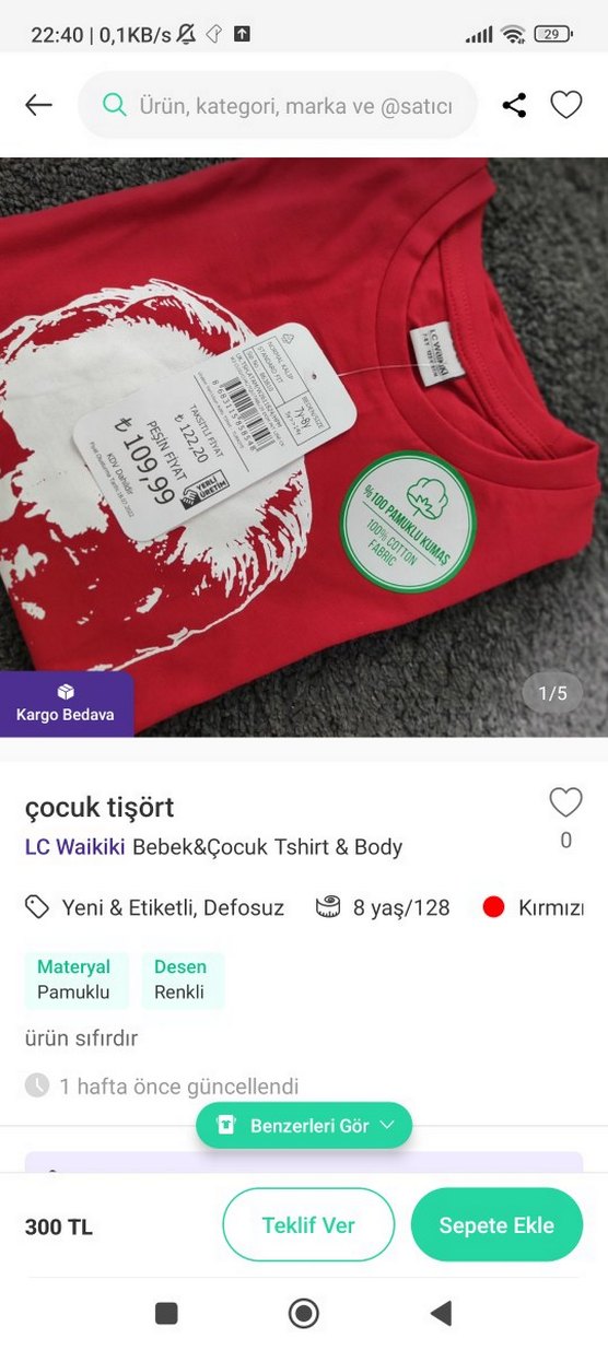 LC Waikiki kırmızı baskılı çocuk tişörtü, %100 pamuklu kumaştan üretilmiştir. Yeni, etiketli ve defosuzdur, 8 yaş/128 beden için uygundur.