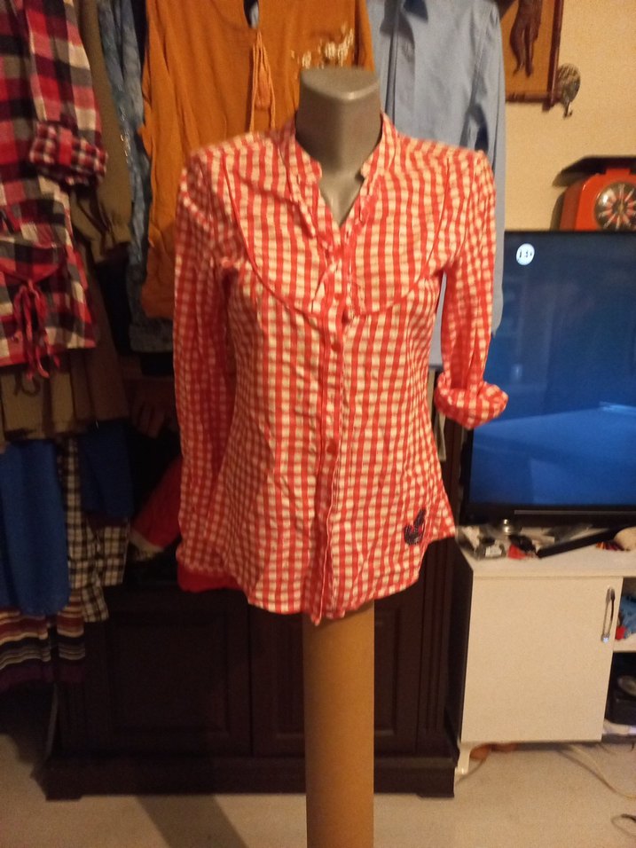 Renkli kırmızı kareli desenli, pamuklu, uzun kollu, düğmeli ve yakalı, günlük kullanıma uygun, dar kesim çocuk gömleği.