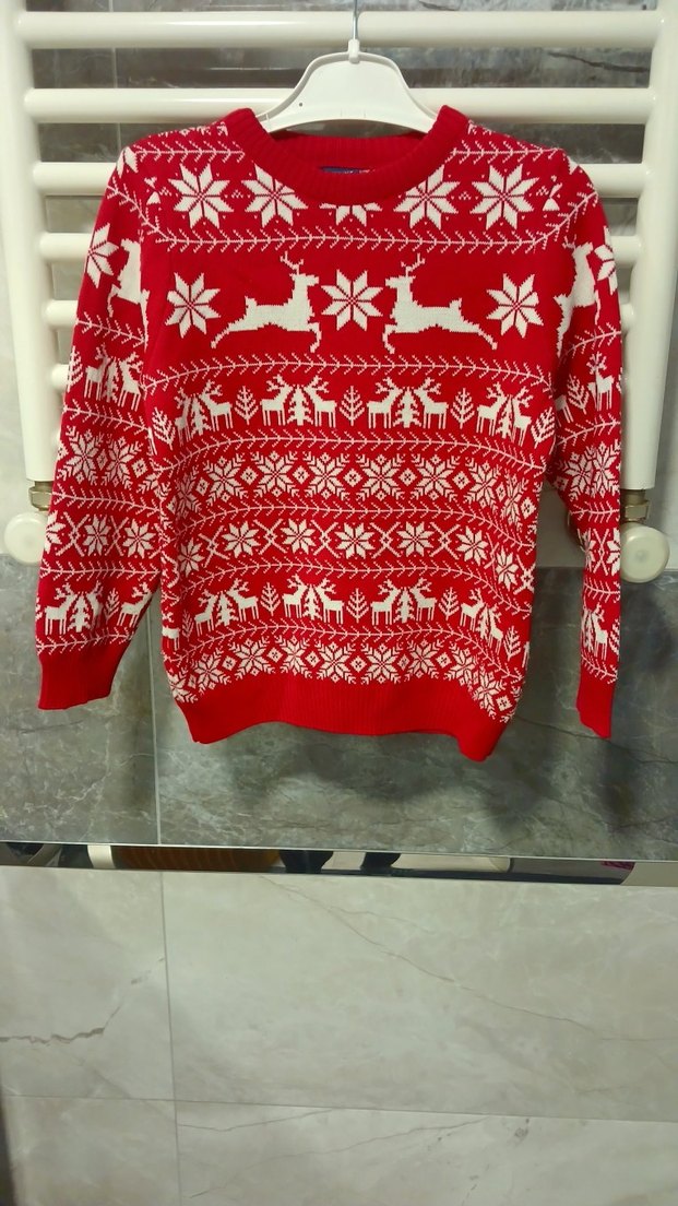 5-6 yaş Nakışlı geyik ve kar tanesi desenleriyle kırmızı triko kazak, uzun kollu ve yuvarlak yakalıdır. Rahat kesimi ve normal uzunluğuyla dış mekan kullanımı için uygundur. ❄️