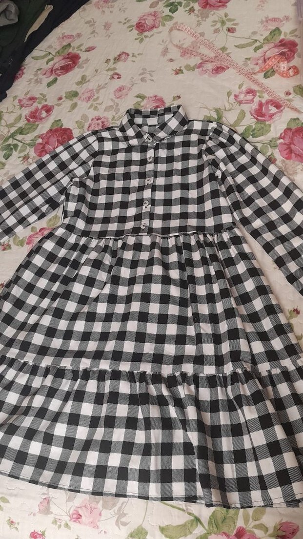 Uzun kollu, bol kesim elbise, yakalı ve fırfırlı detaylara sahiptir. Gri ve beyaz ekose deseniyle bohem tarzda, günlük kullanım için uygundur. 11/12 Yaş. Boy 83 cm. Kol boyu 54cm. Defosu yok. Çok iyi durumda.