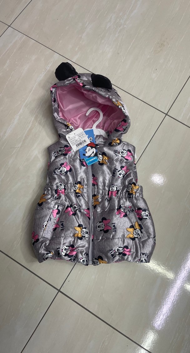 Kız çocukları için kapüşonlu, fermuarlı ve kolsuz yelek. Yumuşak ve sıcak kumaştan, gri zemin üzerine renkli baskılarla, trend sokak stili için uygun.