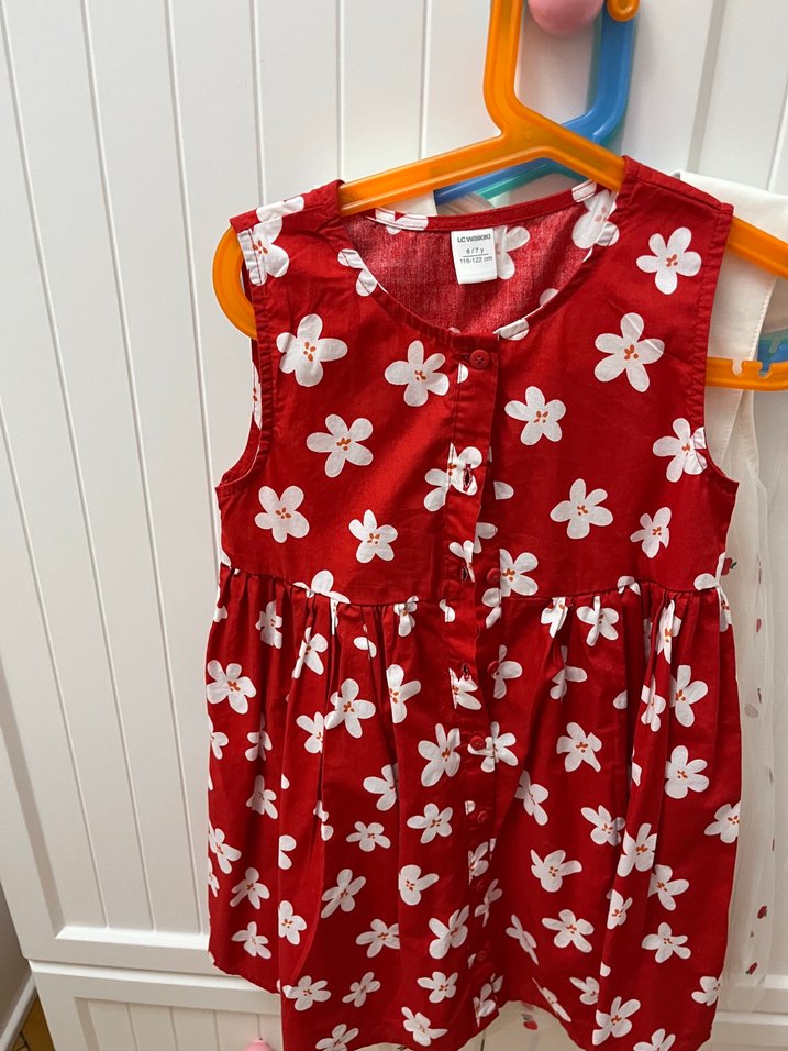 LC Waikiki markalı, kolsuz, pamuk kumaştan yapılmış kırmızı çiçek desenli kız çocuk elbisesi. Düğmeli ve bol kesim, straplez yakalı bohem tarzda.