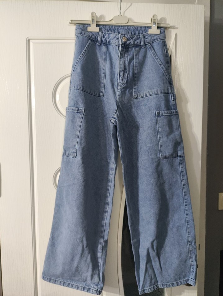 Bol kesim, midi uzunlukta, ince mavi kot pantolon, bel detaylı ve çok cepli, gündelik sokak stili için uygun.