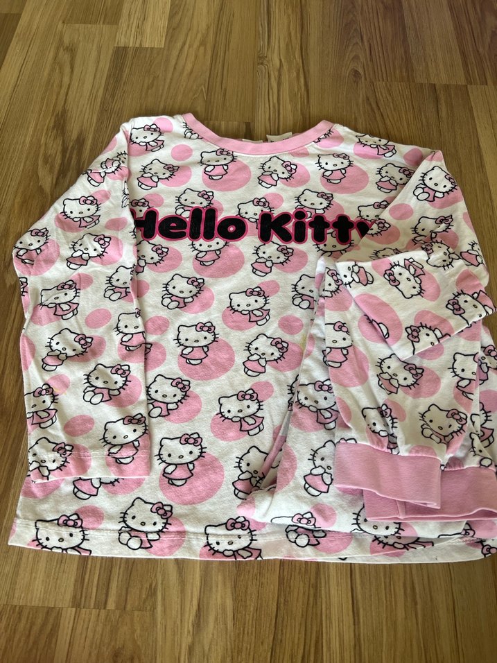 Kız çocukları için uzun kollu, yuvarlak yaka ve bol kesim tişört. Yumuşak pamuklu ve örme dokulu, pastel pembe renkte Hello Kitty baskılı, bohem ve retro tarzda.kız çocuk pijama takımıdır.