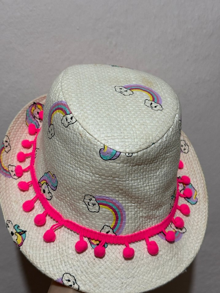 Bu renkli bohem tarzı çocuk şapkası, gökkuşağı ve bulut desenleri ile parlak pembe püskül süslemeye sahiptir. Hiç bir problemi yoktur, sadece şapkanın iç kısmında çikolata lekesi var, yıkanınca geçer. Son görselde belirttim. Orijinal LC waikiki ürünüdür