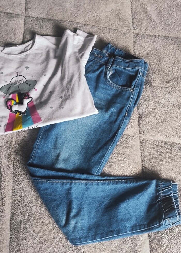 Kot pantolon 10_11 yaş olup, sıfır gibi, tertemiz ve kusursuzdur. Alana tişört hediye