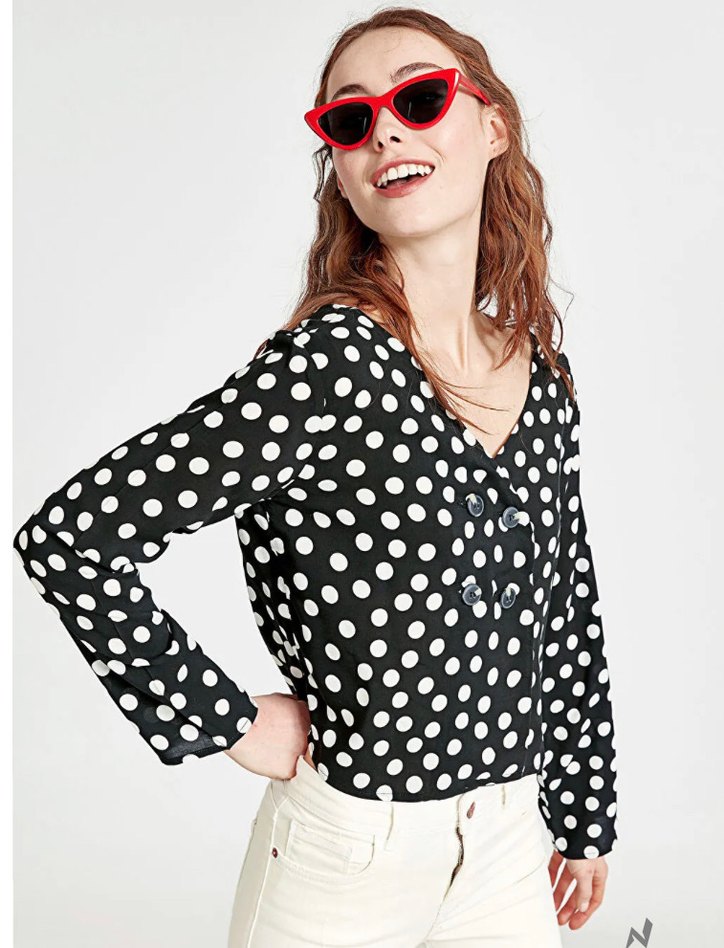 Lc Waikiki Kruvaze Yaka Puantiyeli Bluz Uzun kollu. 38 beden Düğme detaylıdır.Siyah ve Beyaz