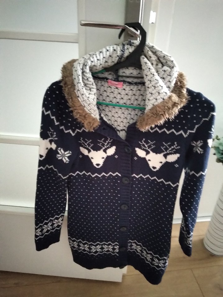 Kız çocuklar için fitted kesim uzun kollu, triko kumaştan yapılmış geyik ve kar tanesi desenli hırka, kürk detaylı kapüşonlu sorunsuz bir ürün
