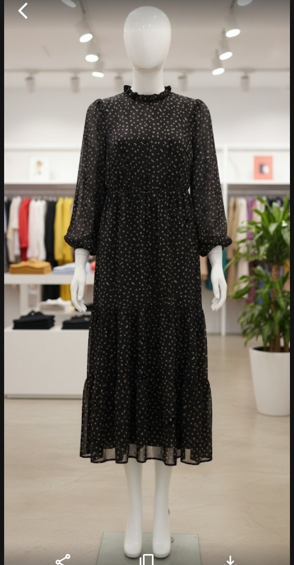 Siyah uzun elbise, bol kesim ve uzun kollara sahiptir. Fırfırlı detaylı, yüksek yakalı bohem tarzda ve puantiyeli desende klasik şıklık sunar.