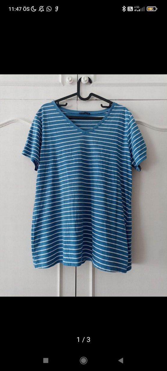 LC WAİKİKİ Mavi Beyaz Çizgili V Yaka Kadın Tişört