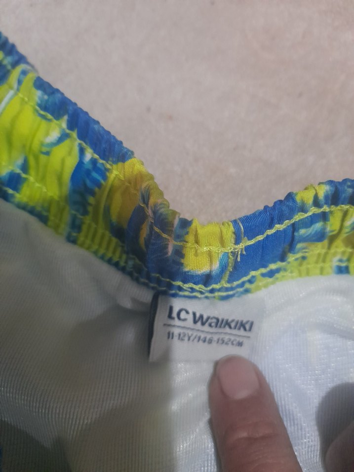 LC Waikiki erkek mayo, açık mavi tie-dye desenli, bol kesim ve kısa boyda. Velcro kapanışlı, plaj için uygun. Beden 11-12Y/146-152CM.