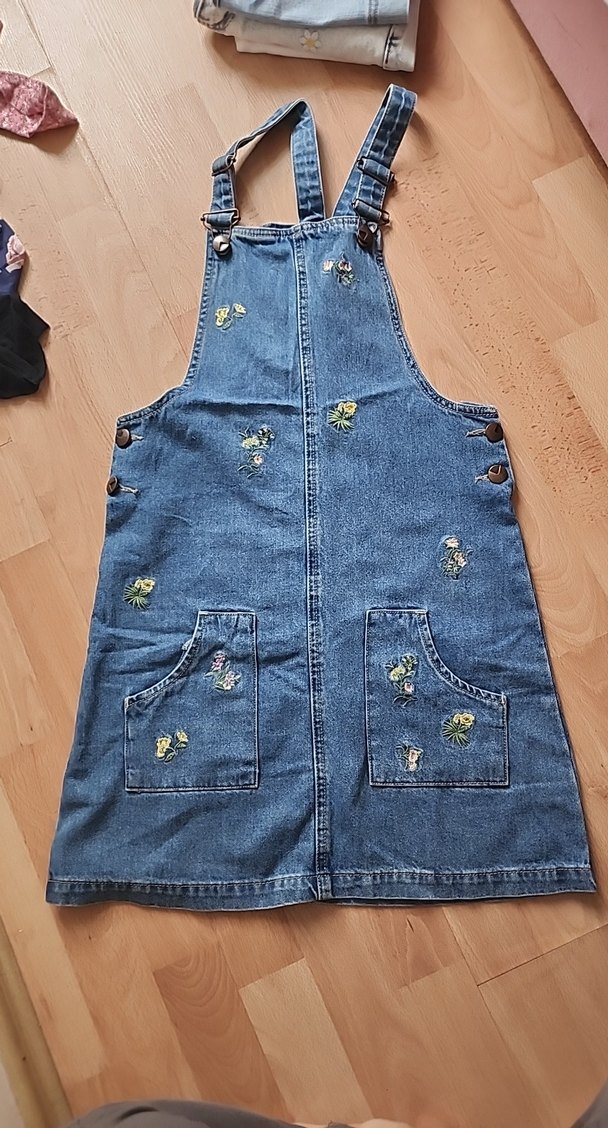 Nakışlı çiçek desenli mavi denim kadın salopet elbise, düğmeli yanlar ve bol kesim. Askısız, kolsuz, günlük kullanıma uygun.