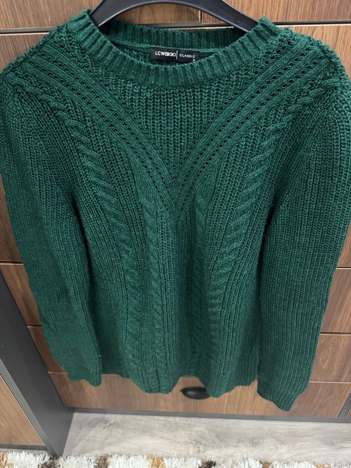 LC Waikiki'den koyu yeşil renkli, örgü yapıda, yuvarlak yaka ve uzun kollu, bol kesim, bohem tarzda kadın kazak. Rahat ve günlük kullanıma uygun. İki koltukaltı arası 50 uzunluk 66 cm kullanıma engel hiçbir sorunu yoktur