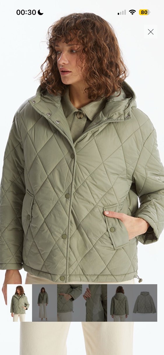 Düğmeli kapüşonlu, geniş kesim kadın mont. Notch yakalı ve uzun kollu, kapitone desende, gündelik sokak stili için uygun, mat yeşil tonlarında.