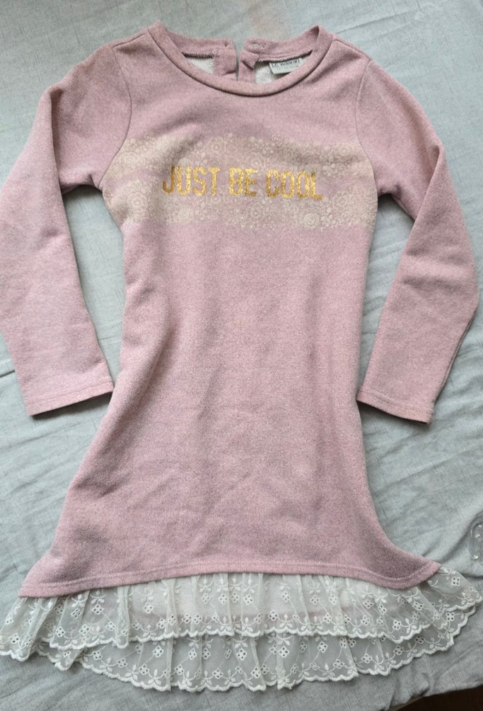 Pastel pembe renkte, uzun kollu, yuvarlak yaka ve bol kesim triko elbisedir. Üzerinde baskı yazı ve etek kısmında dantel detayları bulunur.