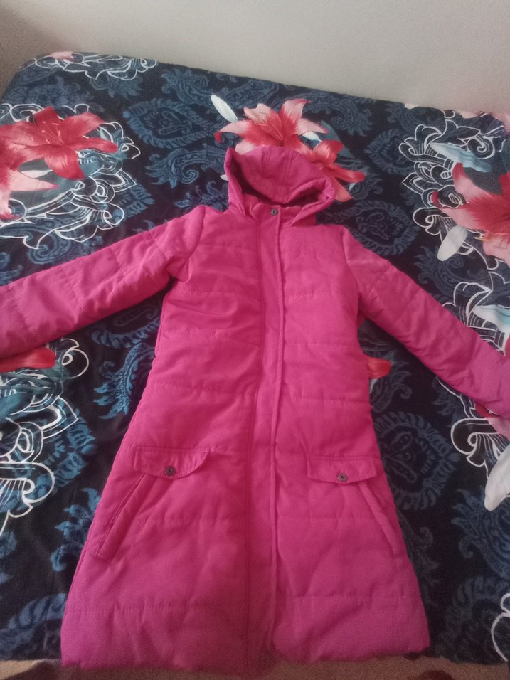 Düğmeli ön kısmı ve kapüşonu olan, pastel pembe renkli kız çocuk montudur. Yumuşak ve sıcak kumaştan üretilmiş, sade ve normcore tarzda, desensizdir. temiz kullanılmış ürün herhangi bir sorunu defosu yok 1 kış kullanılmıştır göründüğü gibi