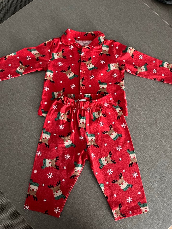 Renkli geyik ve kar tanesi desenli, uzun kollu ve kesimli pijama takımı. Defosuz temiz ürün