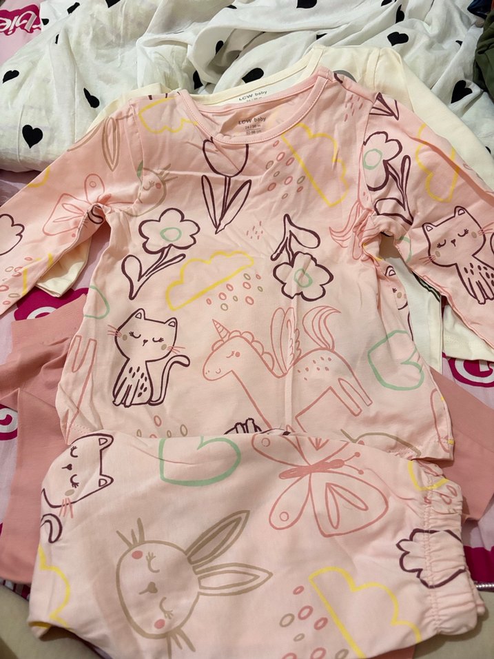 Kız çocukları için pembe, uzun kollu, baskılı ve düğmeli pijama takımı. Yumuşak sentetik kumaştan yapılmıştır.