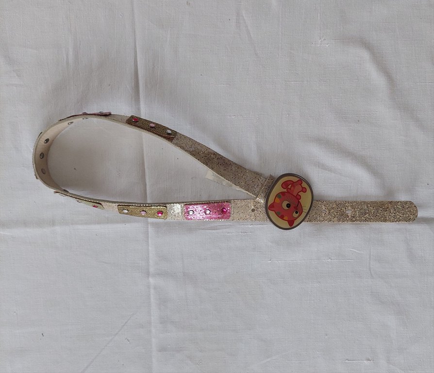 Altın renkli deri kadın kemer, renkli detaylar ve tokalı kapanışa sahip. Vintage, bohem tarzda, eğlenceli karakter tokası bulunur. Hiç bir defosu yok. Ölçülü görselde mevcut