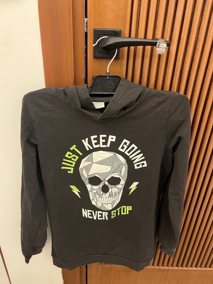 Uzun kollu, yüksek yakalı gri kapüşonlu sweatshirt, gevşek kesim ve baskılı kafatası deseni ile rock punk tarzını yansıtıyor. Yumuşak kumaş ve cırt cırt detaylıdır.