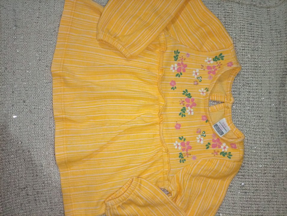 Uzun kollu, kayık yaka sarı kız çocuk çiçek desenleri ve fırfır detaylarıyla bol kesim bohem tarzda.