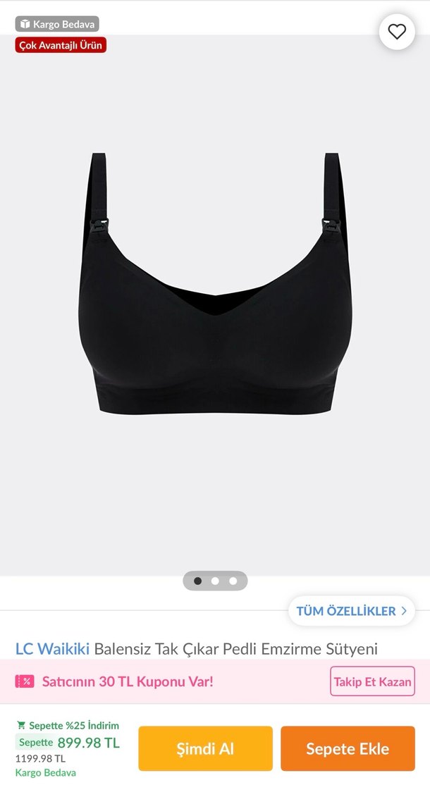LC Waikiki siyah, balensiz ve tak çıkar pedli emzirme sütyeni. Ayarlanabilir askılı ve rahat kullanım sağlar.