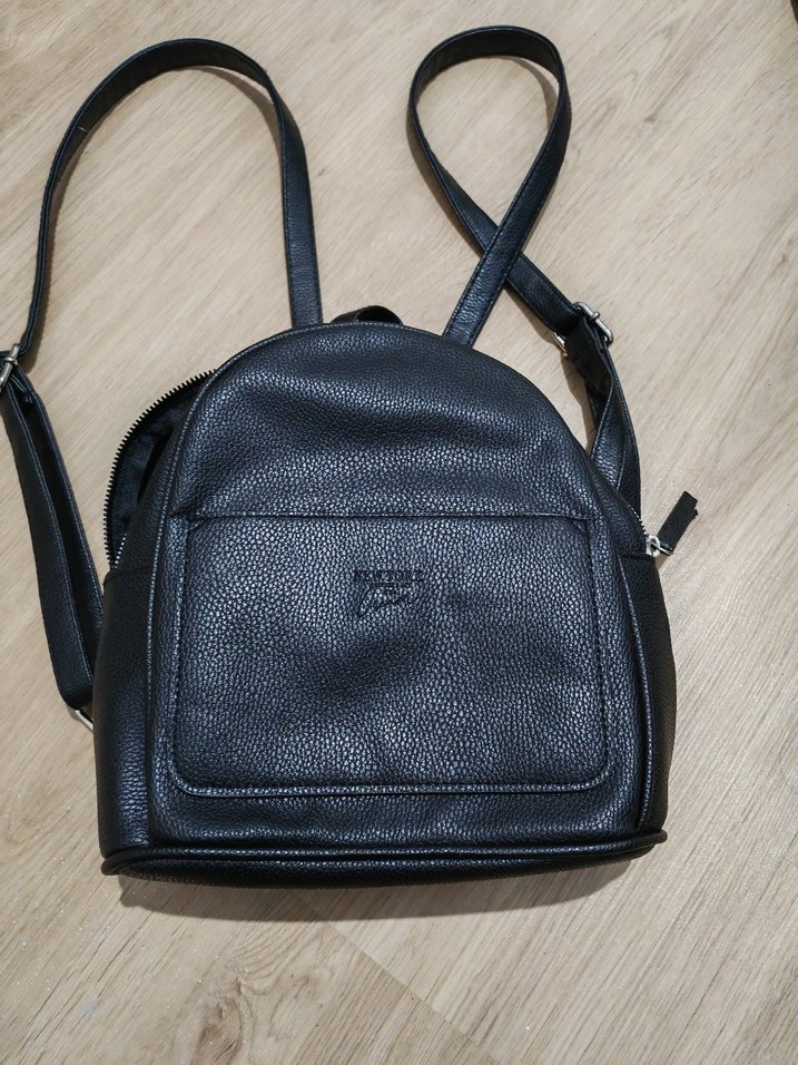 Minimalist tarzda, tokalı kayışlara sahip siyah deri kadın sırt çantası. Günlük kullanıma uygun, desen içermeyen düz yüzeye sahiptir. Yıpranma deforme yoktur