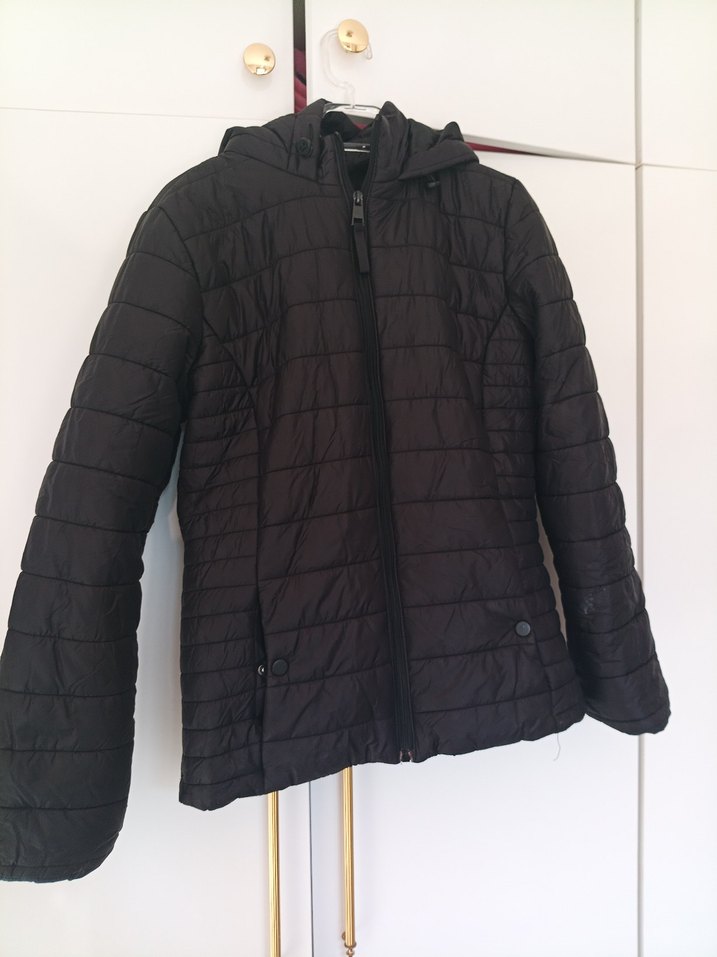 Siyah, fermuarlı ve normal boyda olan bu kadın mont, yumuşak sentetik kumaştan üretilmiştir. yağmur geçirmez