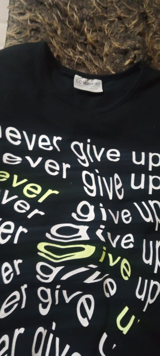 LC Waikiki markalı siyah tişört, beyaz ve yeşil renkte 'never give up' yazılarıyla süslenmiştir. Yuvarlak yakalı, yumuşak kumaştan üretilmiştir. ✨
