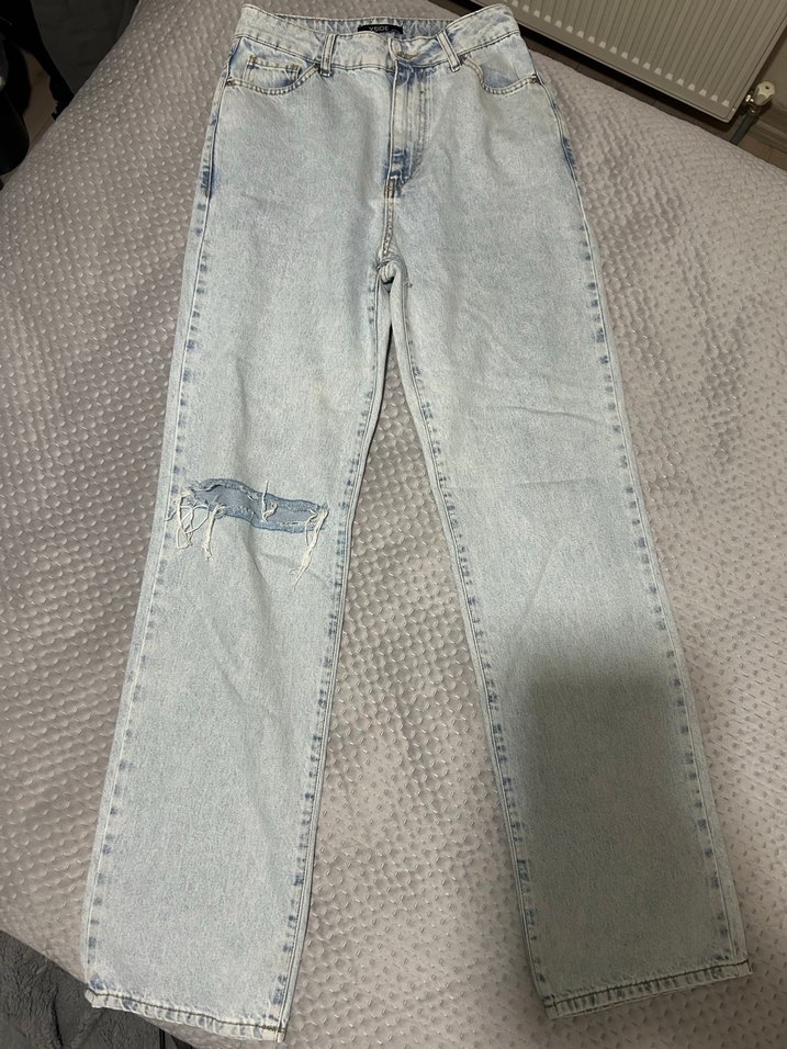 Mavi denimden, yırtık detaylı ve geniş kesim bir kadın kot pantolon. Günlük kullanıma uygun, normal midi boyda, rahat bir sokak stili pantolondur.