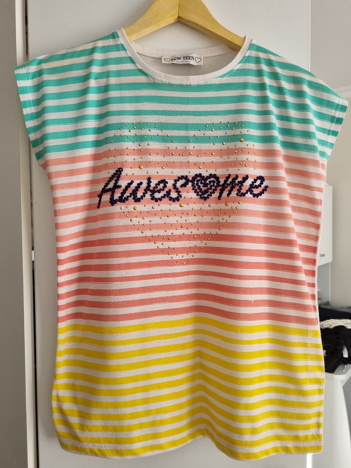 LC Waikiki Teen koleksiyonundan renkli çizgili tişört. • Beden: 15–16 yaş (164 cm) • Kalıp: Standart fit • Pamuklu, hafif kumaş • Ön kısmı nakış yazı ve taş detaylı • Yaz ayları için ideal Taşları eksiksiz, temiz ve sorunsuzdur.