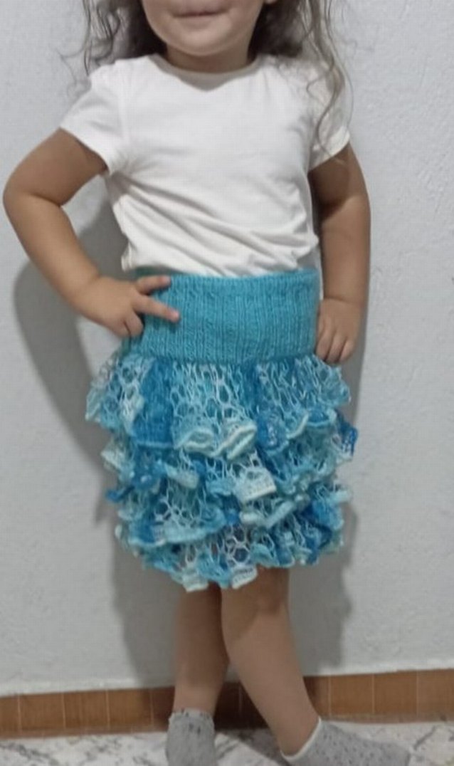 Açık mavi el örgüsü, esnek,fırfırlı kız eteği, bohem tarzı yansıtır.