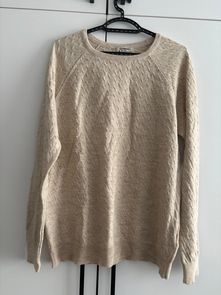 Bej renkli, örgü örme yün kazak, yuvarlak yaka ve uzun kollu, bol kesim rahat ve gündelik tarz sunar.