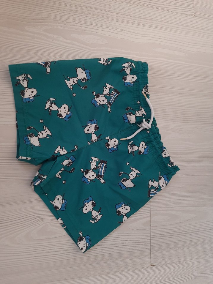 Turkuaz renkli, baskılı çizgi film köpek desenli, ayarlanabilir bel bantlı erkek çocuk deniz şortu.