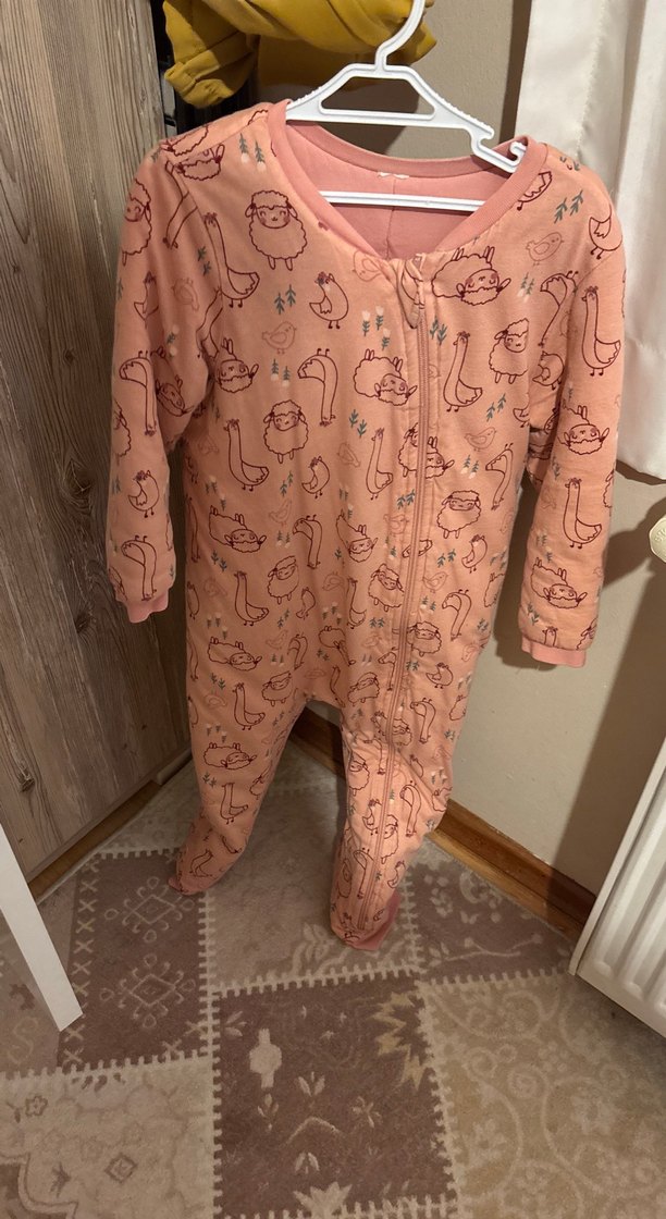 Pastel pembe, uzun kollu ve yüksek yakalı kız çocuk pijaması, ön fermuarlı ve yumuşak, sıcak kumaştan. Hafif hayvan desenli.