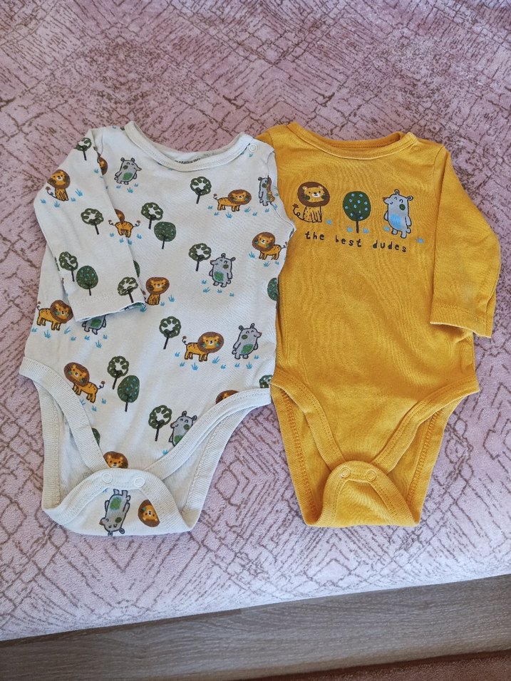 LC Waikiki 1-3 Ay Yumuşak pamuktan yapılmış iki adet uzun kollu bebek body seti. Biri pastel sarı, üzerinde hayvan baskısı ve "the best dude" yazısı, diğeri beyaz, renkli hayvan ve ağaç baskılı. İkisi de bisiklet yaka ve örme kumaşlıdır.