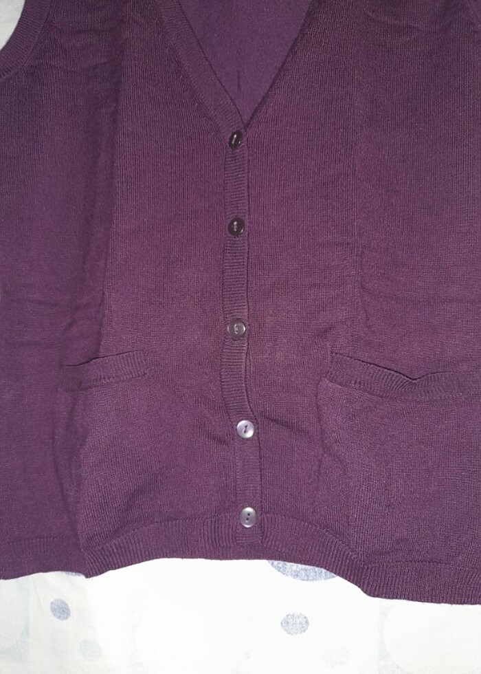M beden, Kolsuz, Onde iki cebi var, Onden dugmeli, Likrali/Triko, Mor renk, Dugmeleri ilikleyince V yaka oluyor, Hic kullanilmamistir, Defosu yoktur