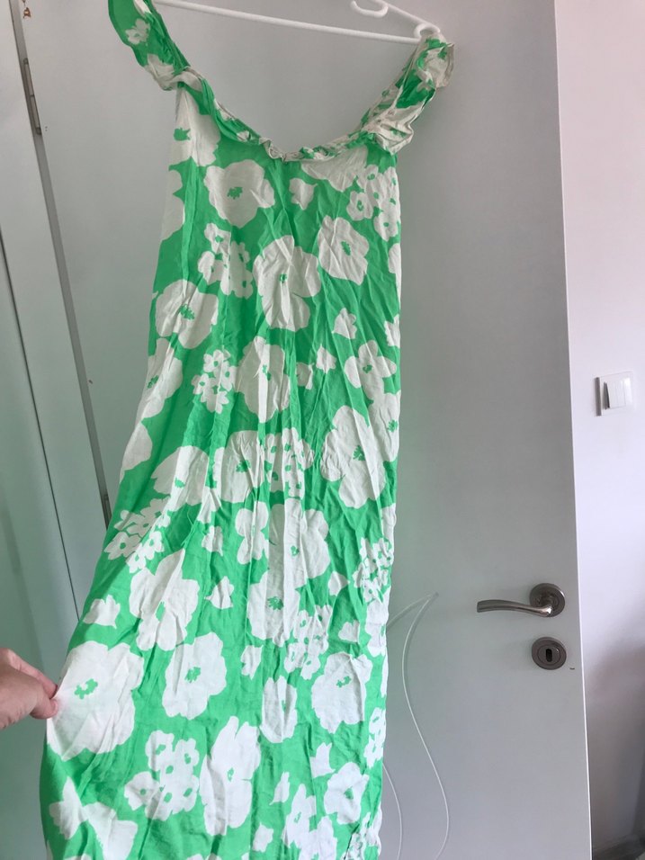Yeşil, bol kesim, dökümlü tasarımlı, hafif batik çiçek desenli ve yumuşak keten kumaştan yapılmış elbise. Günlük kullanım için uygundur.