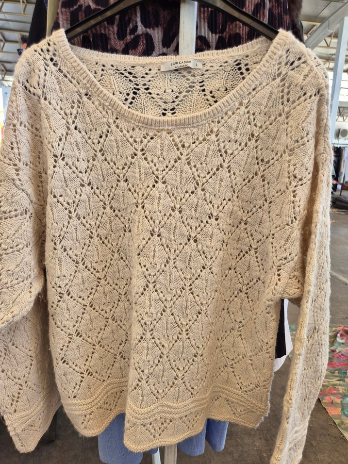 Bej renkte, uzun kollu, yuvarlak yaka ve bol kesim kazak