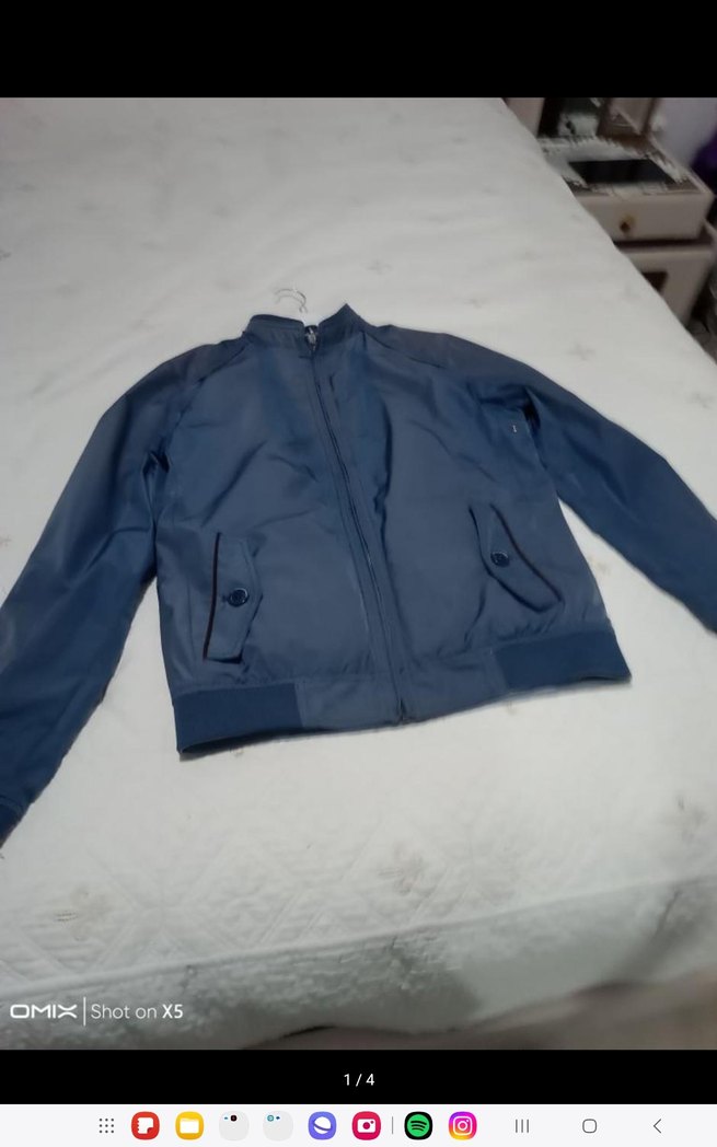 Erkekler için uzun kollu, fermuarlı, notched lapel yakalı, sentetik kumaştan yapılmış mavi gri tonlarında normal boyda street wear ceket. Rahat kesim ve desensiz.