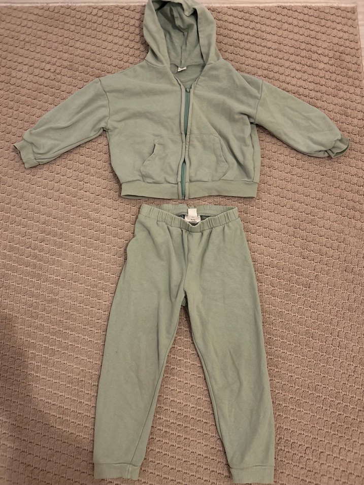Hafif yumuşak kumaştan yapılmış, kapüşonlu fermuarlı ceket ve uyumlu pantolondan oluşan haki renkli bebek takımı. Uzun kollu ve notched lapel detaylıdır.