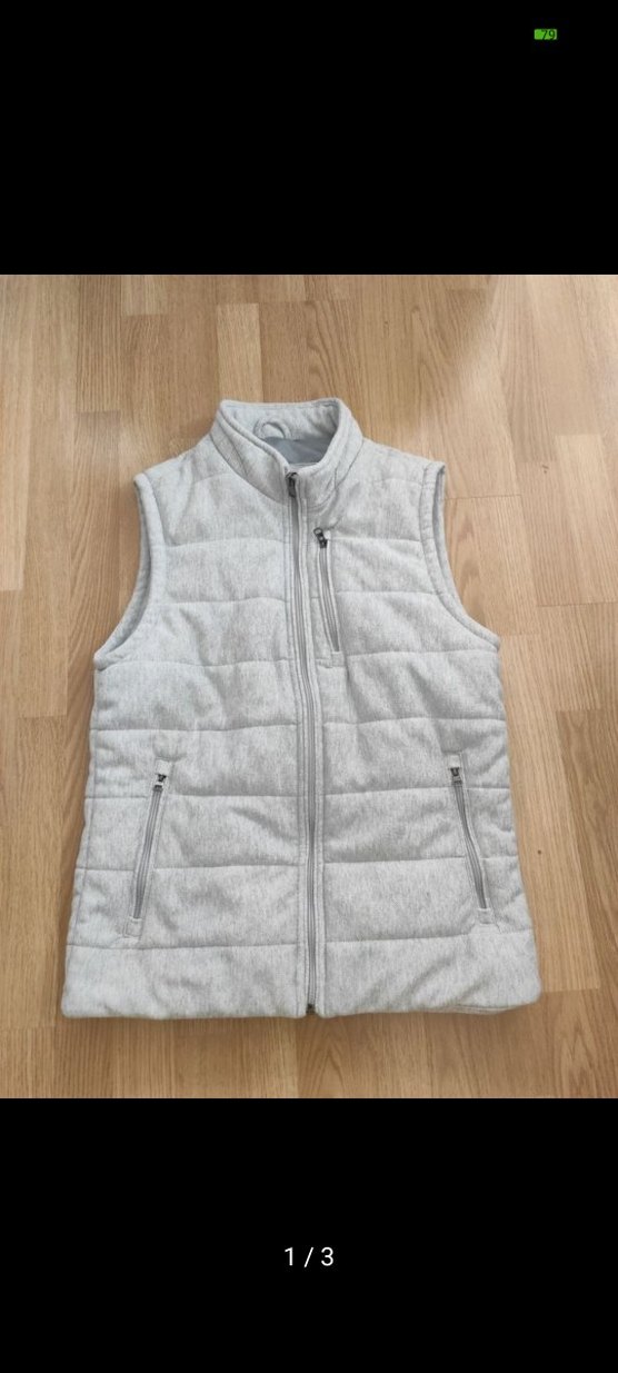 Gri renkli, yüksek yakalı ve fermuarlı cepleri olan kolsuz yelek. Rahat ve sıcak tutan yumuşak kumaştan, dar kesim ve kapitone detaylı.