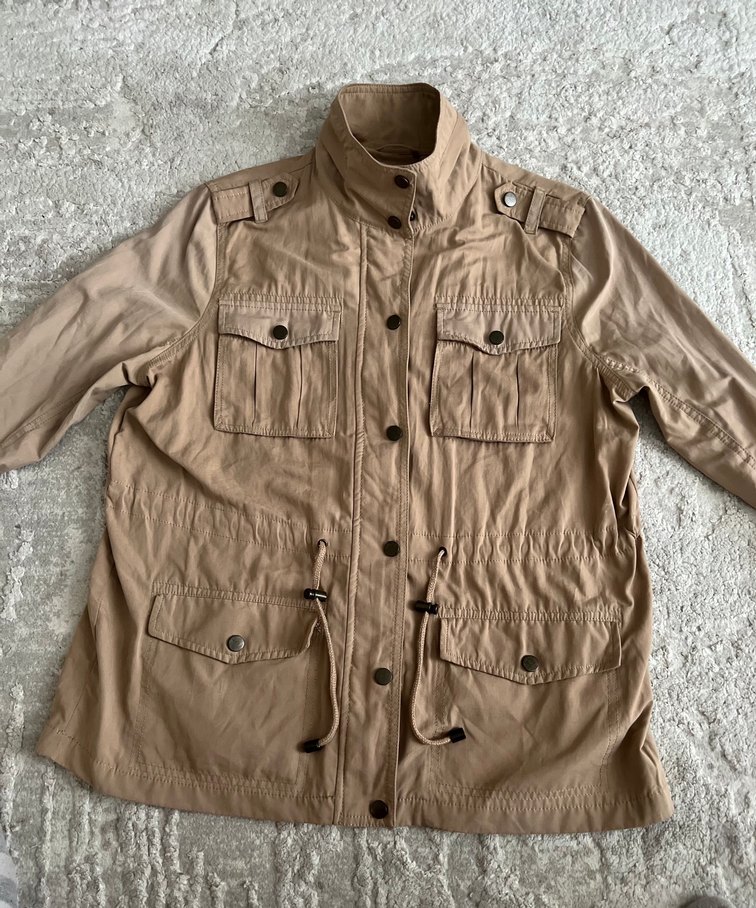 Bej renkli, düğmeli, uzun kollu ve rahat kesim kadın ceket. Keten kumaştan, çıtçıtlı çoklu cepleri ve kesikli yakasıyla günlük sokak tarzına uygun.