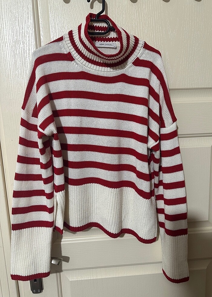 kırmızı beyaz çizgili triko kazak boğazlı kazak ürün bi kaç kere giyildi tüylenme mevcuttur o yüzden uygun fiyat yazdım