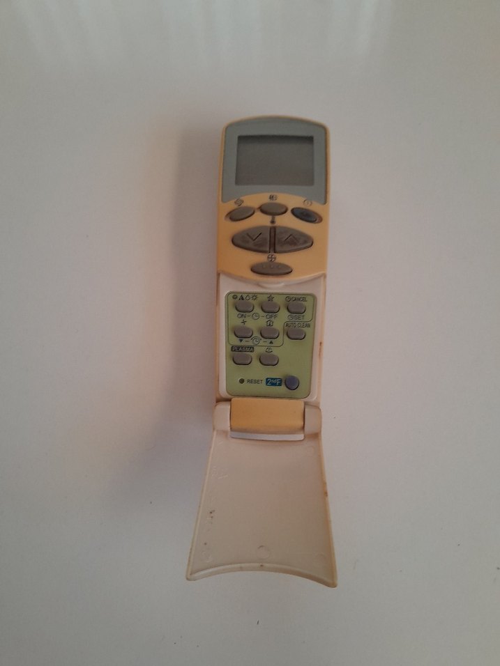 LCD ekran ve çeşitli fonksiyonlu düğmeler içeren açık renkli klima kumanda cihazı, açılır kapaklı. arka kapagı yokdur