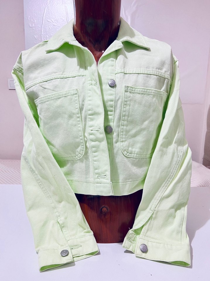 Düğmeli önü ve notalı yaka detaylı kadın denim ceket, uzun kollu ve regular fit. Yumuşak keten kumaştan, pastel yeşil renkte, kısa boyda tasarlanmıştır. Günlük sokak stiline uygundur.