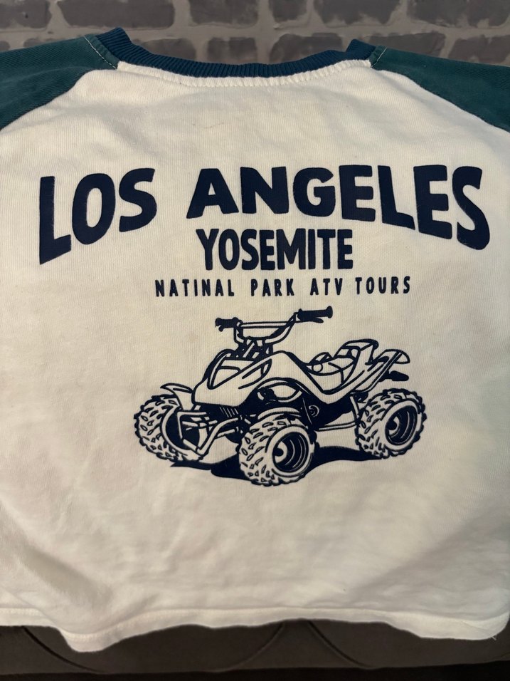 Beyaz renkli, kısa kollu ve bol kesim erkek çocuk tişörtü. Üzerinde ATV motosiklet baskısı ve 'Los Angeles Yosemite National Park ATV Tours' yazısı bulunur. ️