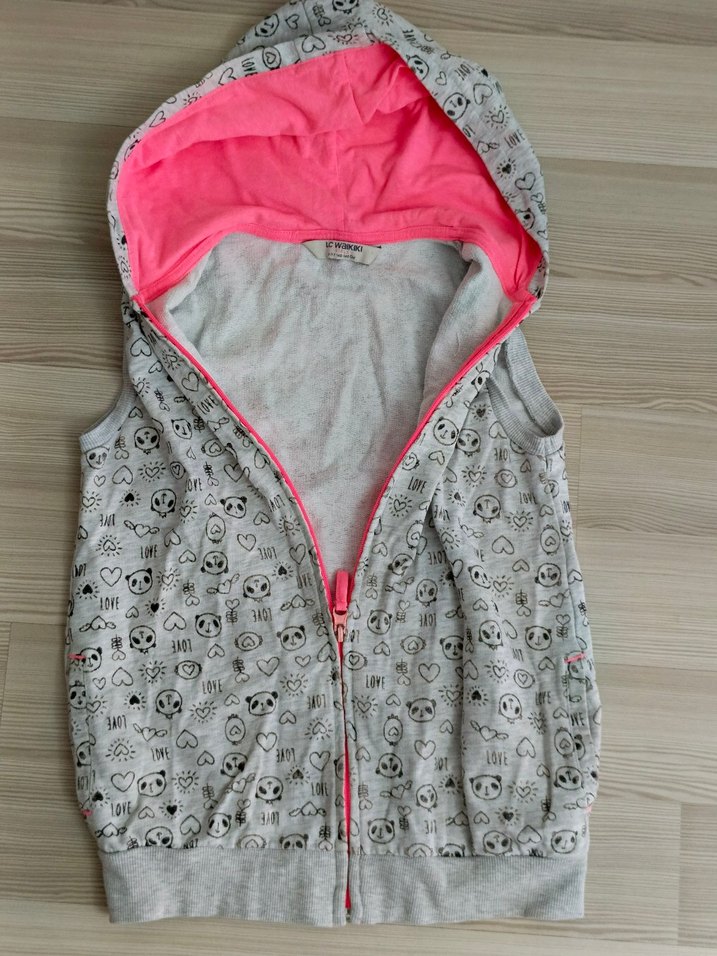 Boy 52 cm koltuk altından koltuk altına 40 cm Gri kapüşonlu, fermuarlı ve baskılı desenli kız çocuk yeleği. Yumuşak ve sıcak kumaştan, iç kapüşonu parlak pembe renkte. Trendy ve rahat stil için ideal.