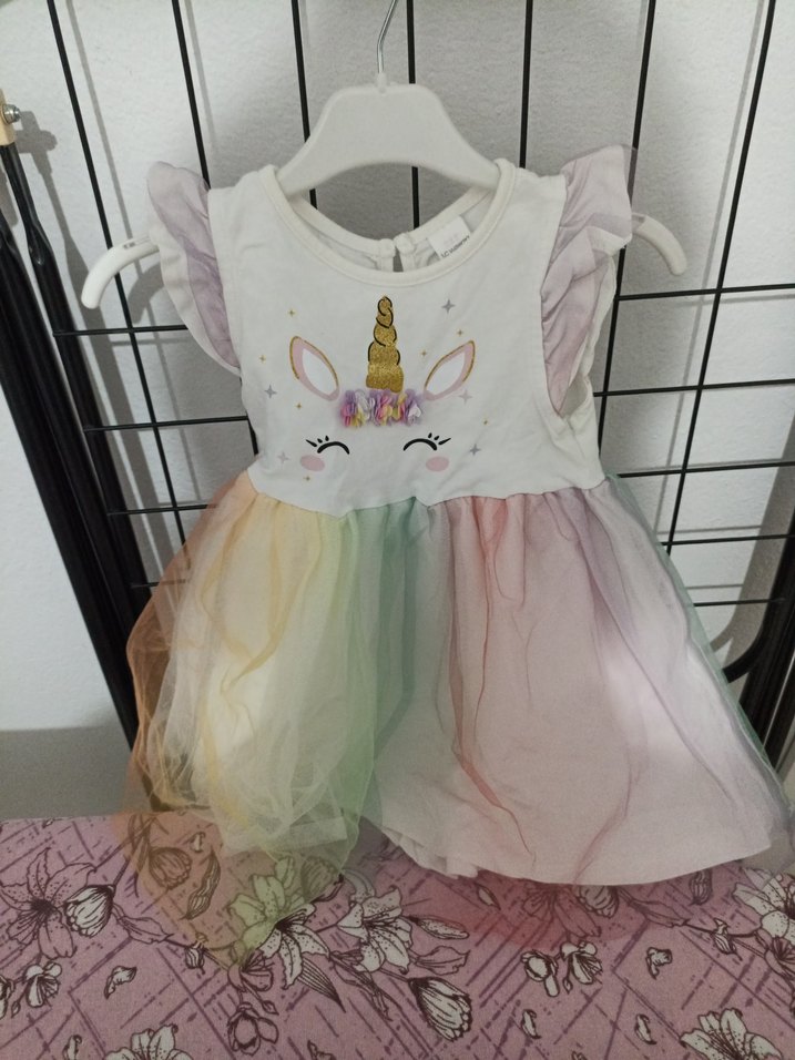 Pamuklu, fitted kesim kız çocuk elbisesi; pastel renkli etek, fırfırlı kısa kollu ve unicorn baskılı, yuvarlak yaka.