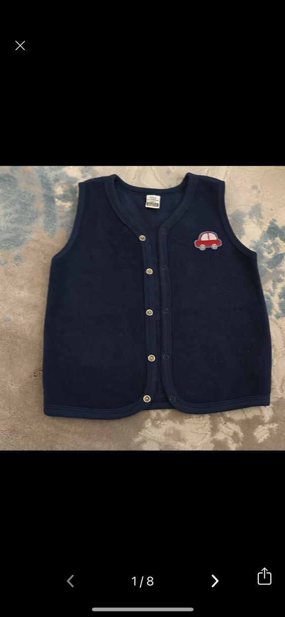 Lacivert erkek çocuk yeleği, düğmeli ve bisiklet yaka. Kırmızı araba detayı bulunur, rahat ve şık bir sokak giyim tarzı sunar.